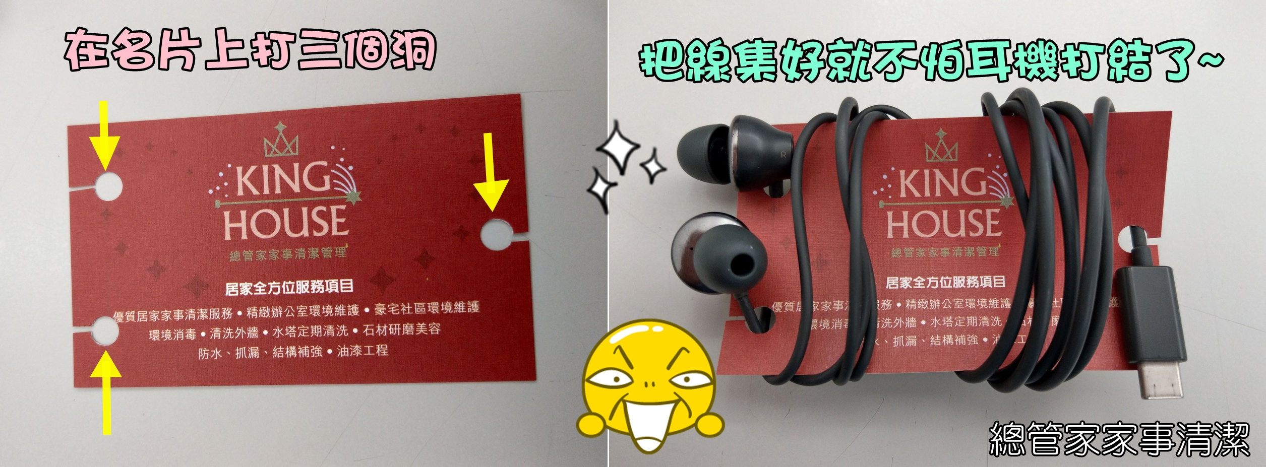 準備一張名片大小的紙卡(有厚度的最佳),照著上圖用打洞機打三個洞再剪開一條細細的縫隙,就可以得到一個簡單好用的耳機集線卡囉!讓你的耳機不再因為打結而縮減使用壽命了!