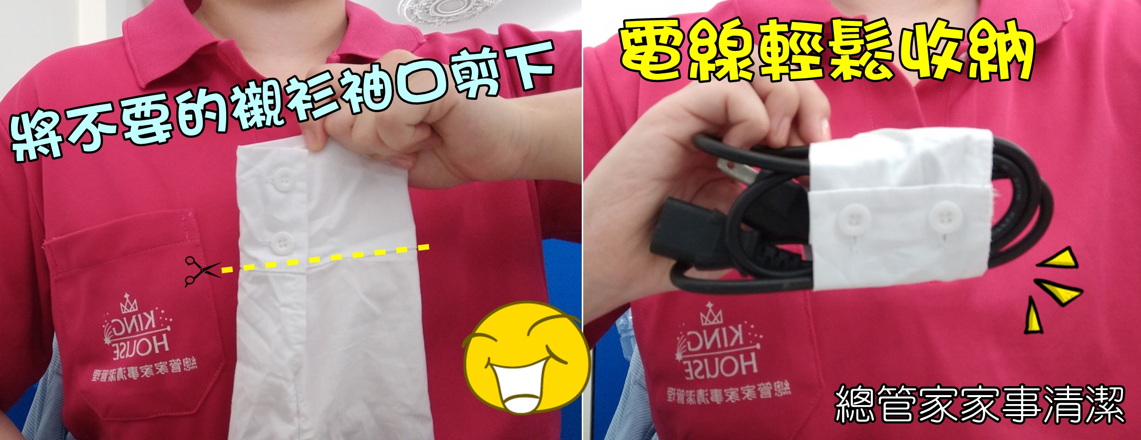 家中不要的襯衫將袖口剪下後,就變成好用的集線器了!還可依使用方式多縫上扣子還能收納更多小條的線喔!
