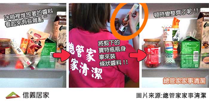 若你以為剩下的寶特瓶瓶身沒有作用,那就大錯特錯了!剩下的瓶身可以用來裝一些條狀的調味料,排列下來使你的冰箱更加整齊呢!