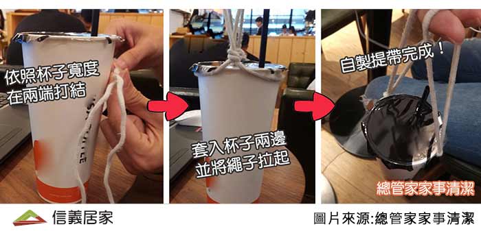 由於現在政府的環保政策,使得飲料店提袋都需要收費,但只要使用家中不用的繩子,就讓你方便又省錢。