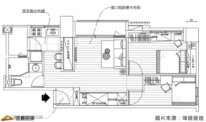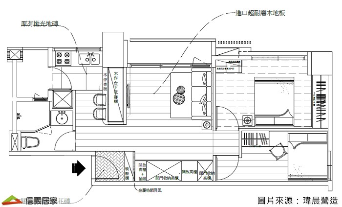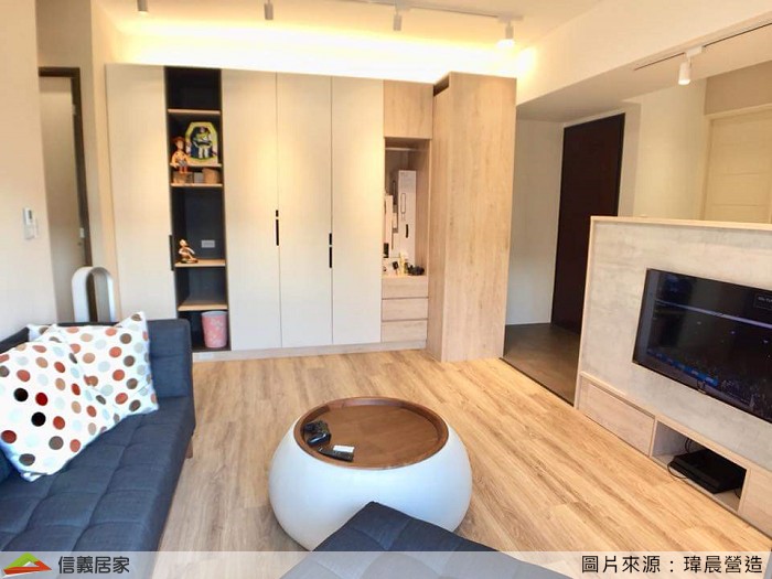 主要建材:新作天花板 、燈光配置、系統櫃收納、pvc卡扣木紋、家具配置、軟件裝飾
