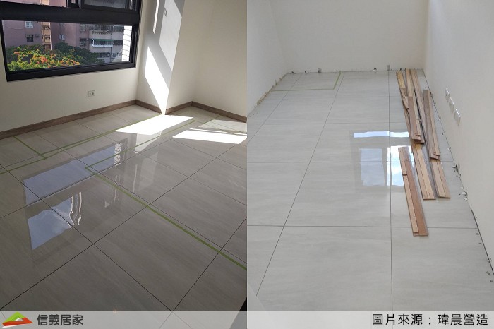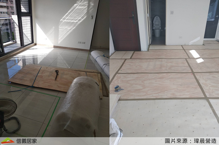 開工的第一個步驟,要先用紙膠帶貼在地上確認空間感。接著拆除原有踢腳板後,依序貼上塑膠板及薄木板保護原有拋光磚。
