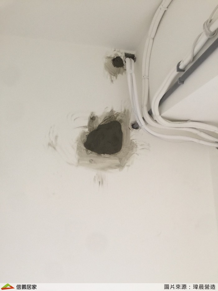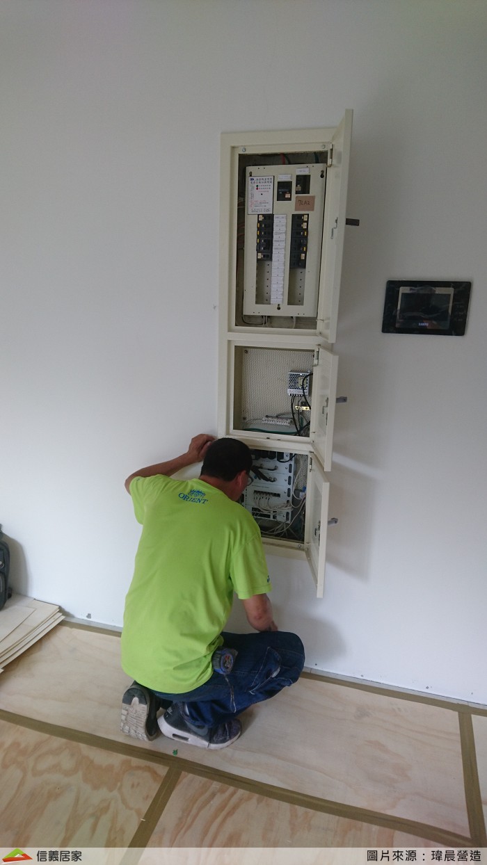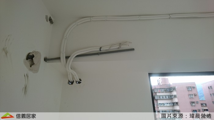 地板保護完成後,水電師傅先進場勘查原屋內的配線情況,並依照規劃及需求調整插座及燈具的出線位置。