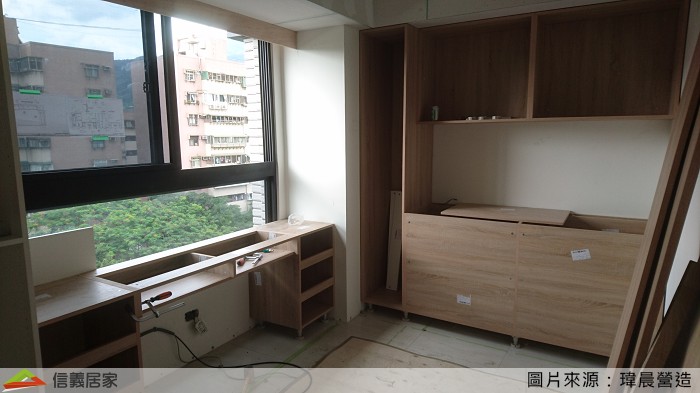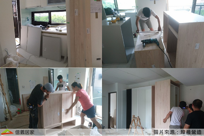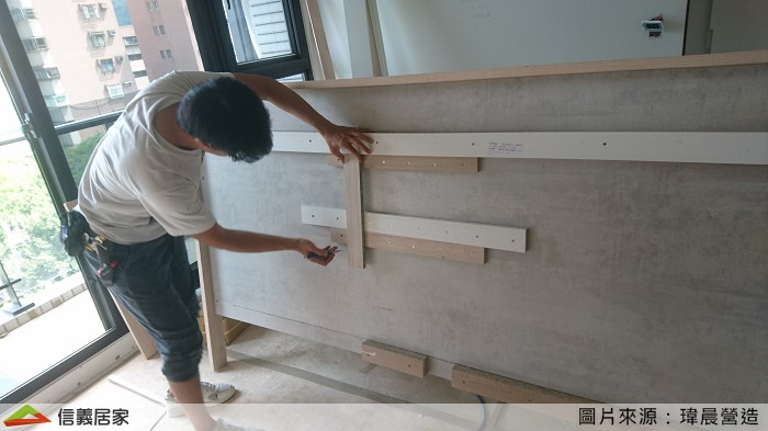 木作完成之後,系統櫃工班開始進場。系統櫃工程是本案的重要工項,所有材料在工廠加工完成後,運到現場分類並開始組立,依照現場的尺寸再進行小幅度的切割修改。組立的過程中,需特別注意每組櫃體之間的連結強度,將來承重時才不容易變型。另外,因考慮將來會將電視吊掛在電視牆上,師傅們特別依照電視吊架的尺寸進行櫃體結構補強。只要多用心,系統櫃也能呈現接近木作的效果!