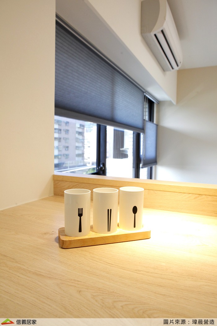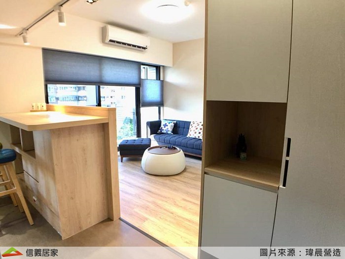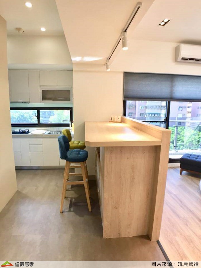 入門玄關的左側就是開放廚房,原本的空間較小沒有地方放置微波爐和烤箱等電器,為了兼具空間的穿透感,我們結合了電器矮櫃、吧檯餐桌和電視矮牆三種功能,解決了收納、使用和方位三個不同層面的問題!