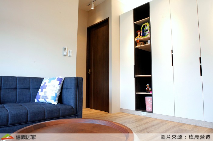 綜合收納櫃解決了屋主最困擾的各式大型收納問題,不論是吸塵器、電風扇、行李箱等等通通收到櫃子裡。開放櫃裡都是屋主的珍藏,利用顏色的搭配讓笨重的櫃體看起來更輕盈些!