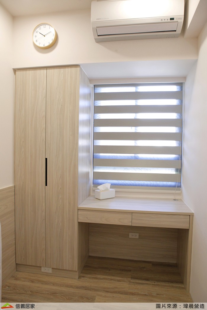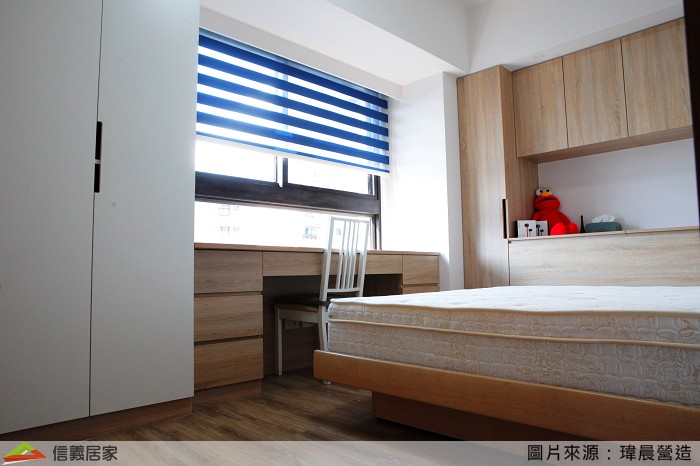 一走進主臥室,就看到滿滿的陽光灑進屋內,衣櫃、書桌、床頭高低收納櫃充分利用大樑下方的空間,化解壓樑的風水考量,也讓空間看起來更整齊。另外,主臥室跟孝親房都選用斑馬簾,無論是功能或裝飾效果,都比一般窗簾或捲簾好,清潔上也可直接擦拭非常方便。
