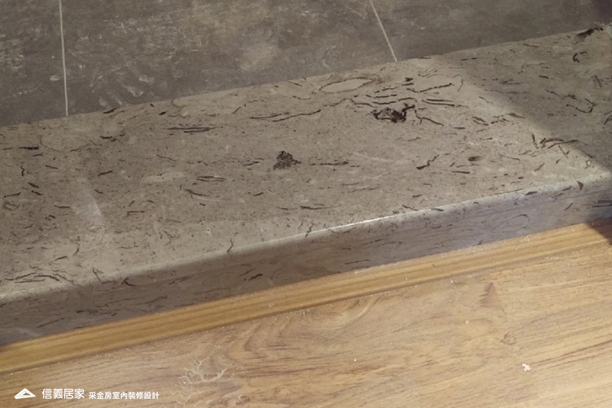 ▲先下門框後,再下大理石,並做三個面包覆門檻,再下矽力康固定,可以確保水不會從這裡滲出去。