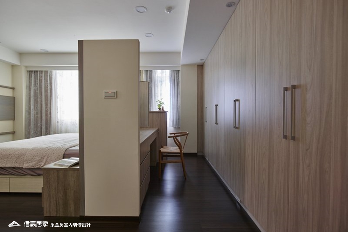 ▲不頂到天花板的屏風設計,讓主臥的採光可以進入更衣空間裡。