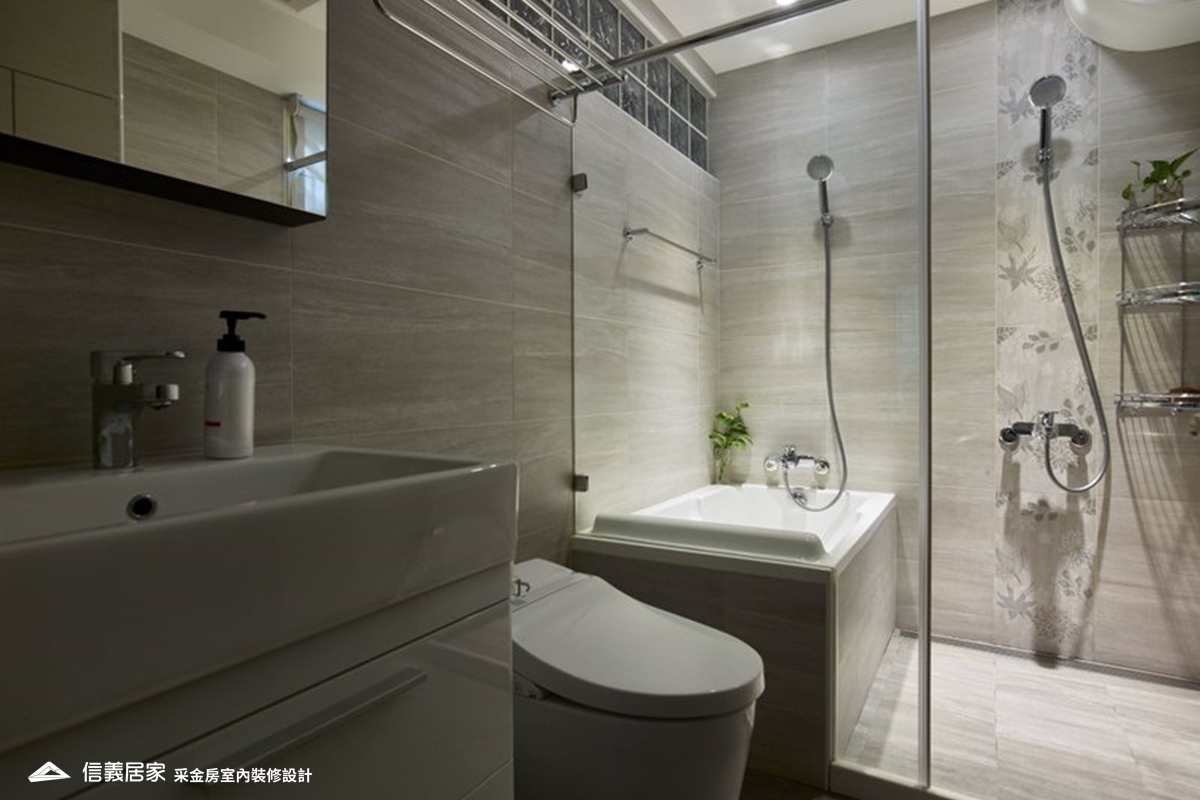 運用透光建材,是避免暗房,加強光源的設計手法之一。像是相鄰的兩間衛浴,其中一間因為管道間或是隔局限制,無法擁有臨窗通風設計,這時可以在牆面上方砌上玻璃磚的方式,一方面引光,一方面又顧及隱私,再搭配排風機,讓衛浴空間永遠保持乾燥舒適。