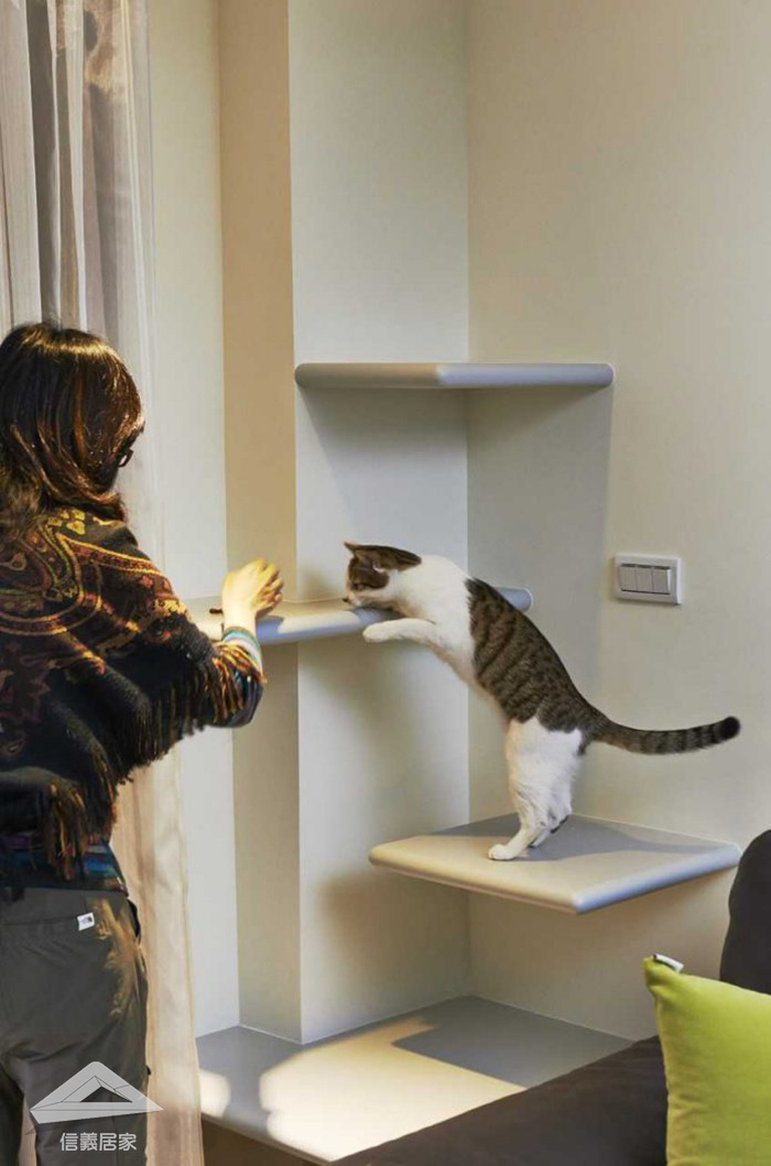 由於貓咪和狗狗習性不同,空間設計上也多有巧思,考量貓咪的行為模式,可在天花板設置貓走道,或是在書房配置活動式層板,大小和耐重都要拿捏好。通往各區域的大門,也能考慮開一個寵物專用的門片,方便牠們自在穿梭。另外在臥房或書房也可設計一個休憩空間,讓毛小孩有個安靜不受干擾的獨處時光!