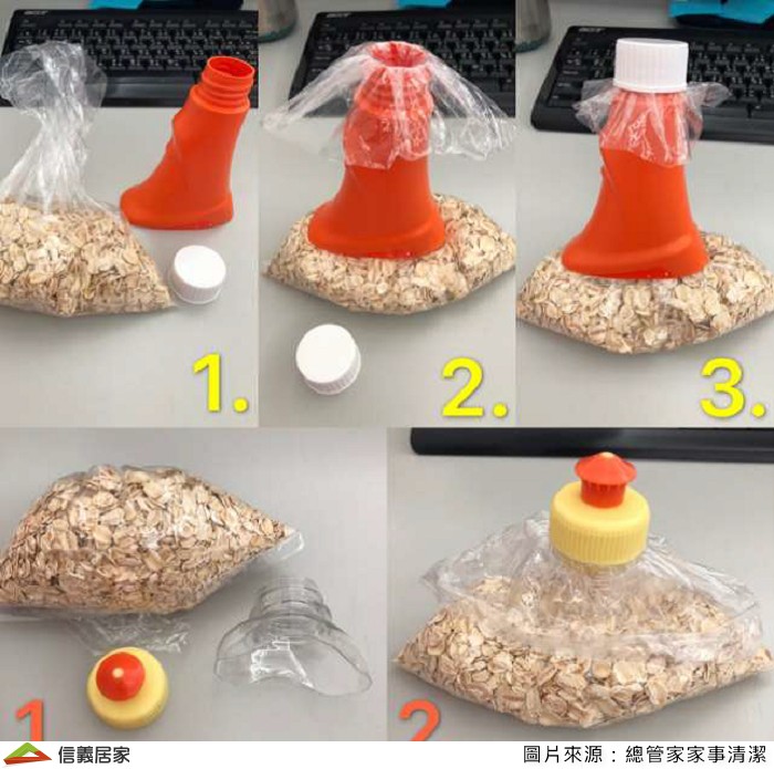 把不要的瓶子剪開後,留下瓶口與瓶蓋的部分,再把需要保鮮的食品穿過瓶口後,將蓋子蓋起來就完成了!