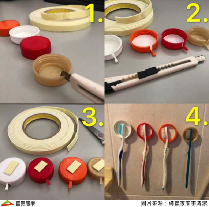 蒐集瓶蓋也可以變身為實用的居家小物。於瓶蓋口切一個小縫後,就可以擺放牙刷,是不是超可愛的啊!