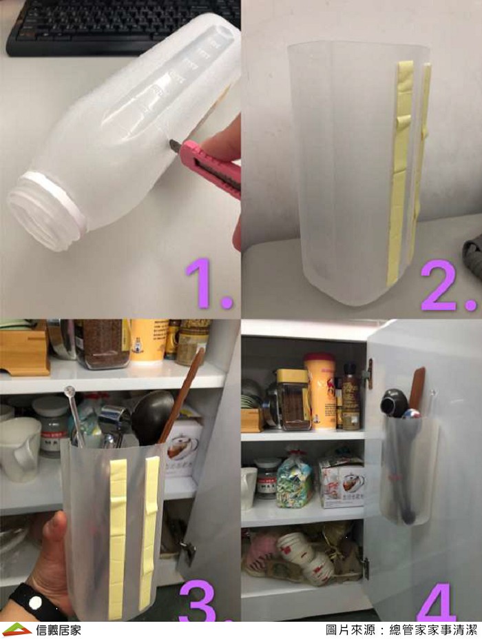 家中有櫥櫃要放置餐具的話,可以利用保麗龍雙面膠,將瓶子黏在櫃子門上,拿東西就非常方便。