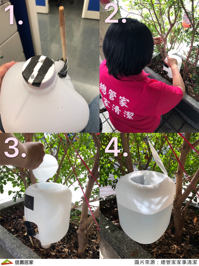 家裡有種植物的話,可以利用大的桶子製作成澆花器材!還不用怕一次澆太多水把花草淹死。小的瓶子則可掛在有樹枝的樹上面,讓水沿著樹枝流下!