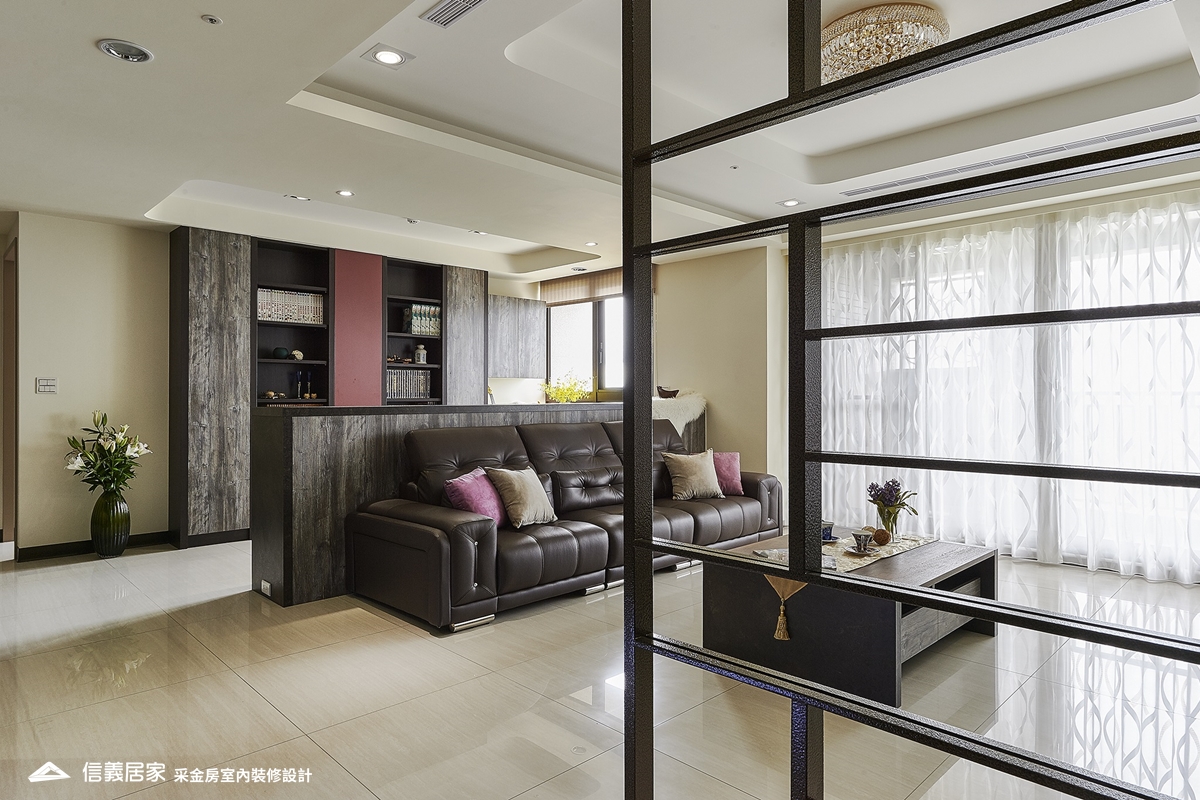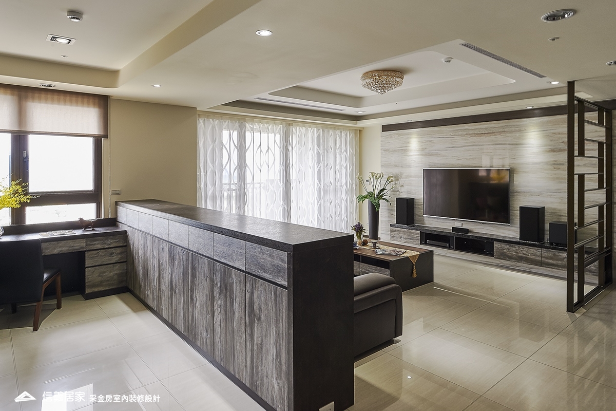 為了使視野更開闊,玄關採用鏤空設計屏風,讓客廳的自然光源可以照進玄關。自然波紋的大理石電視牆,帶出客廳的氣勢,也因此尋找與自然線條風格相似的材質,呈現於電視矮櫃及沙發背櫃、屏風、書櫃等櫃體立面,讓開放式的公共空間呈現明亮且自然的氛圍。