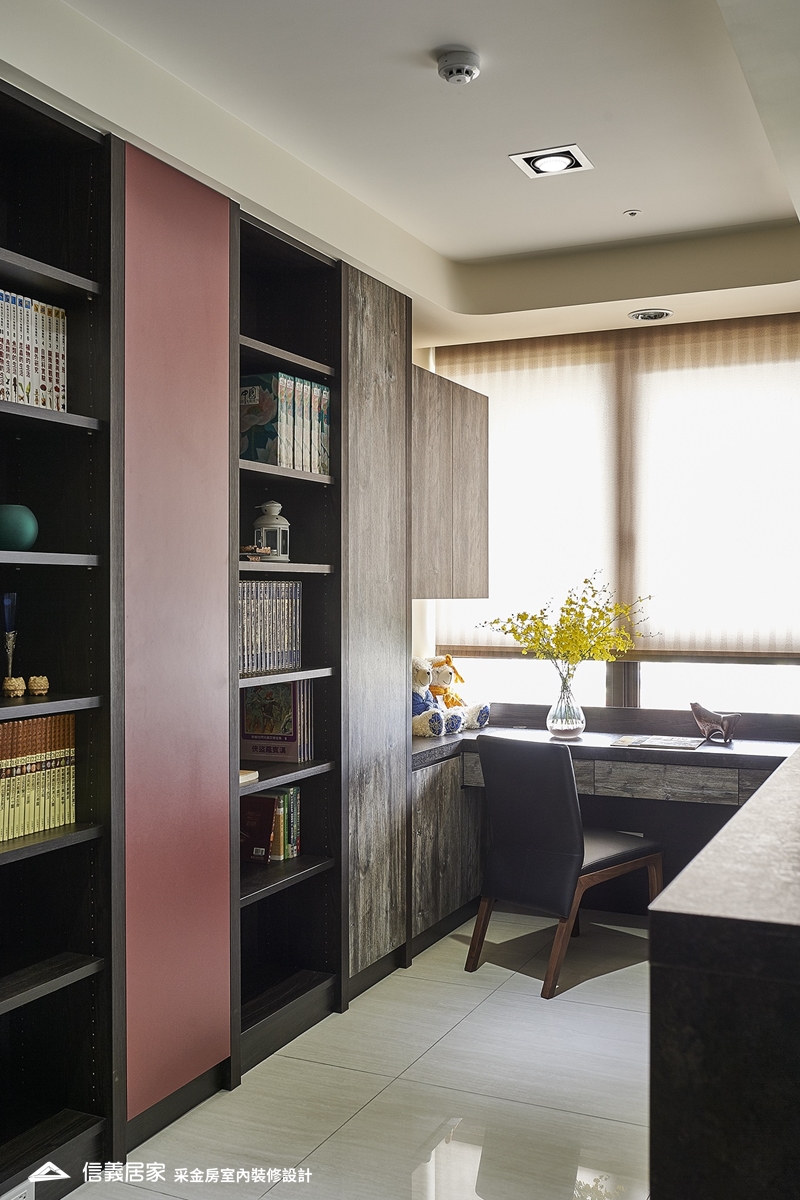 與客廳同採開放式設計的書房,僅以屏風矮櫃做空間區隔,使視野通透、得以延伸,讓光線照進室內的每一個角落。書櫃採垂直直線切割方式,不僅拉高天花板高度,也讓櫃體中間的紅色面板成為顯眼的跳色設計。