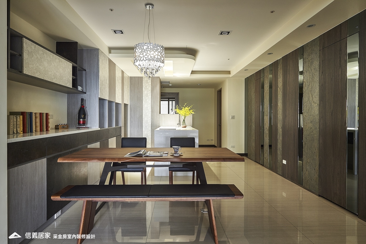 雖然是從毛胚屋接手設計,但面對原本的空間格局規劃,屋主希望保持公共空間的寬敞性,並能滿足一家五口的收納機能,對於健康更是講究。於是采金房設計團隊運用開放式設計,讓公共空間裡的各個場域視野能彼此貫穿流通,放大空間感。同時利用線條的幾何切割方式,將許多進出私密空間和衛浴的門片及櫃體隱藏,也讓空間視覺統一,拉高原本較為壓迫的天花樑柱問題。保留原本廚房位置,僅在餐廳中間規劃一中島吧檯,提供夫妻兩人品酒聊天的小天地。全室採用空調+全熱設備規劃外,並大量採用環保材質,維護全家人的健康生活品質。