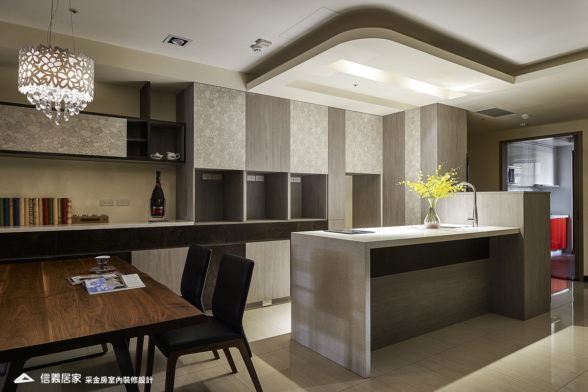 將餐廳通往私密場域的廊道虛擬化,因應屋主想要有一個可以讓家人烘焙及泡茶聊天的空間,因此在餐桌與廚房中間設計一中島吧檯,可做為廚房出菜台,亦成為空間動線的樞紐。並將餐櫥櫃、電器櫃等櫃體整合在同一側,滿足屋主想要的強大收納機能。
