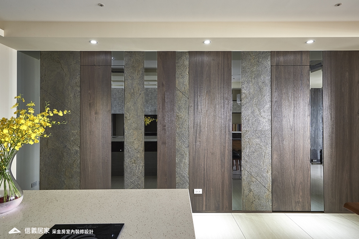 整個空間的色調以沈穩的深色系做搭配,加入局部的跳色設計,為空間增添層次感。尤其是面對餐廳、通往主臥及衛浴的牆面,利用木紋、薄石板、鏡面的線條交錯,將門片隱藏其中,形成樂趣。