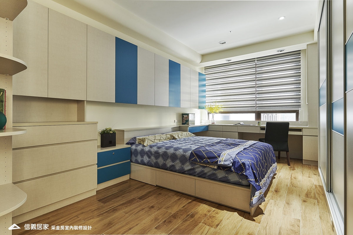 本案規劃為四房,以符合一家五口的需求,同時在每個房間的樑下及牆面,加入大量收納空間,如衣櫃、儲藏櫃及書桌等,並大膽運用色彩襯托每個房間的特色。