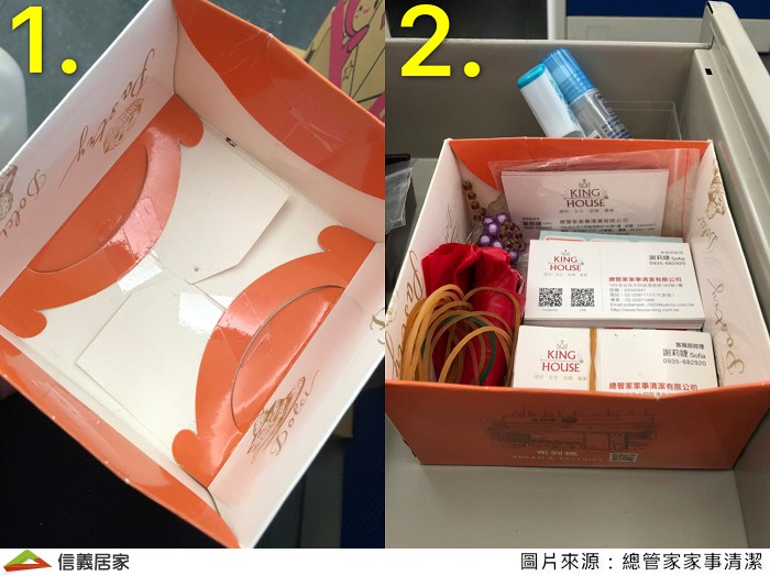 沒想到在麵包店買糕點的包裝外盒也非常實用呢!把四個角落壓進去後黏起來,就可以當做抽屜分類的收納小幫手~真好用!