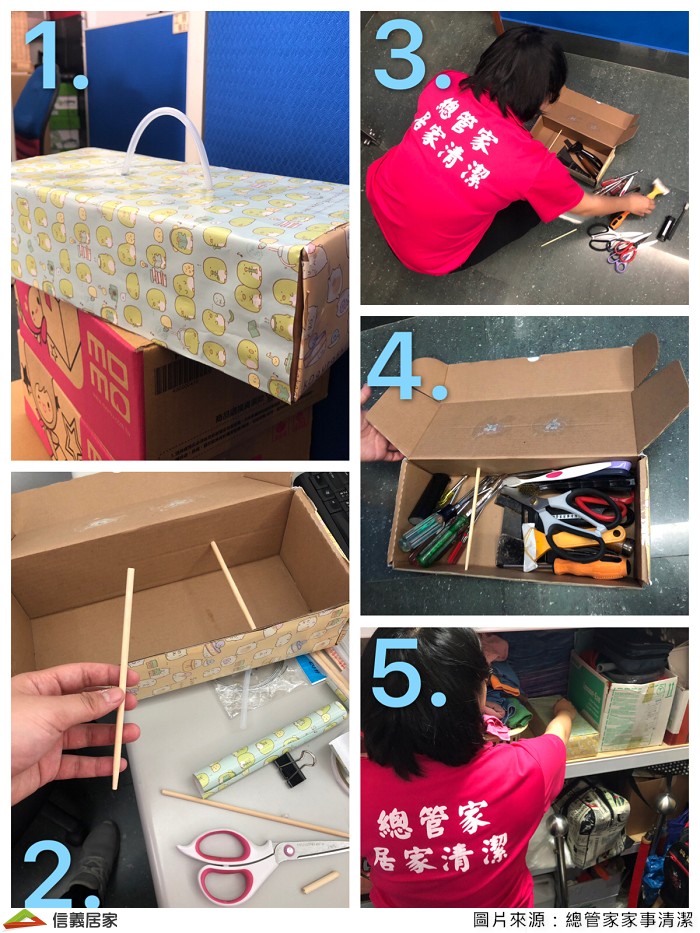 鞋盒也是好用的收納盒之一。稍微改造一下,在盒子外面自行黏上喜歡的包裝紙,再於盒子上方加裝個把手,就可以變成工具箱,擺放在隨手可得的地方,非常方便呢!