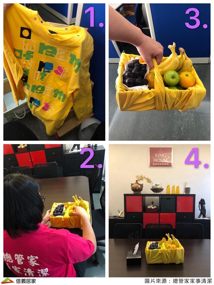 如果想要將家裡的水果裝在一起的話,可以拿一件不穿的乾淨衣服包裝盒子,將兩邊袖子打結,就能變成手提把,拿出來的時候也很可愛呢~
