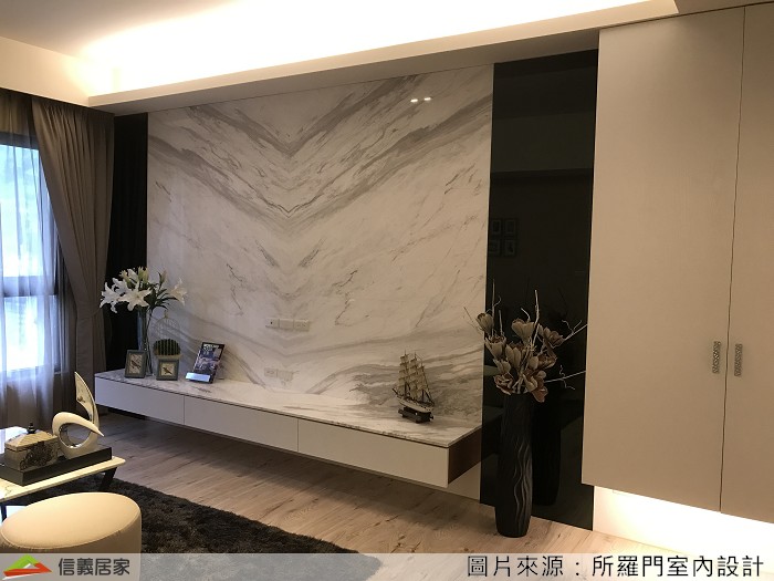 ▲電視主牆與電視櫃檯面使用同一塊石材,主牆兩側再用黑色鏡面玻璃來襯托石材,鏡面玻璃有放大、增加視覺空間的效果,藉由製造視覺的假象,使整體空間感覺更加寬闊。