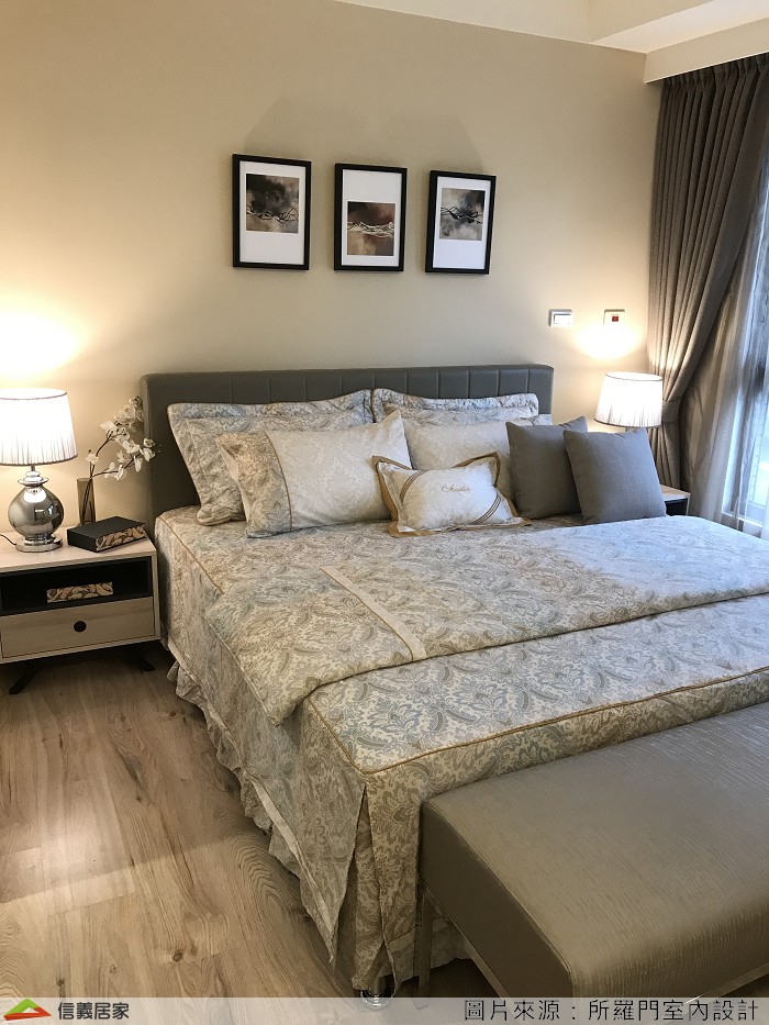 ▲床頭主牆使用藤色跳色,滿足屋主夫婦喜歡藤色的溫暖氛圍。搭配的傢俱和色調也非常適合整體空間。