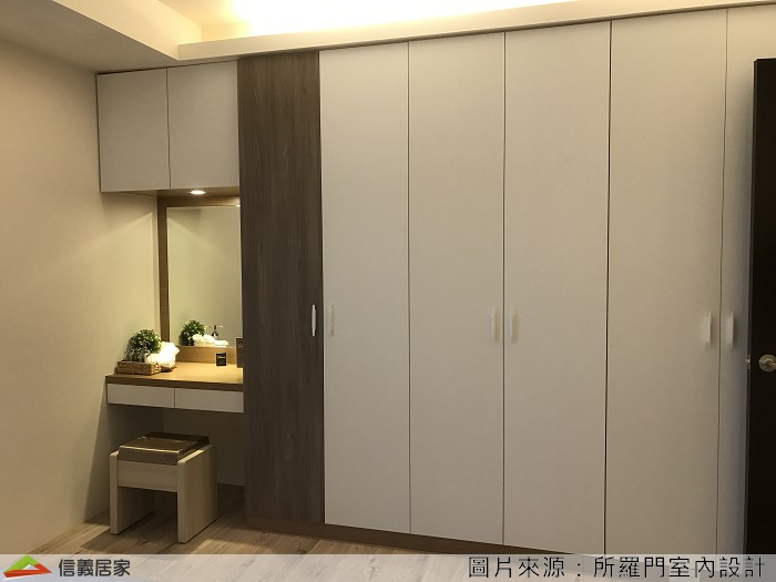 ▲衣櫃使用系統櫃施作。因為主臥室空間較大,能有非常足夠的衣物收納空間,並設有女主人專屬的梳化區。