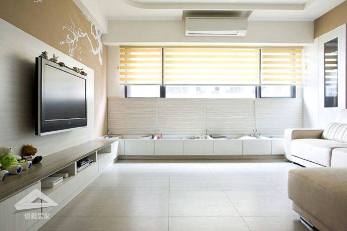若將電視陳設櫃與收納櫃結合,不僅增加收納功能,更符合裝潢美學一舉兩得;如果想讓空間放大效果,建議消費者挑選收納櫃顏色時,可以與牆面搭配同色系,讓空間有延伸之感,使客廳在視覺上變得寬廣又明亮。