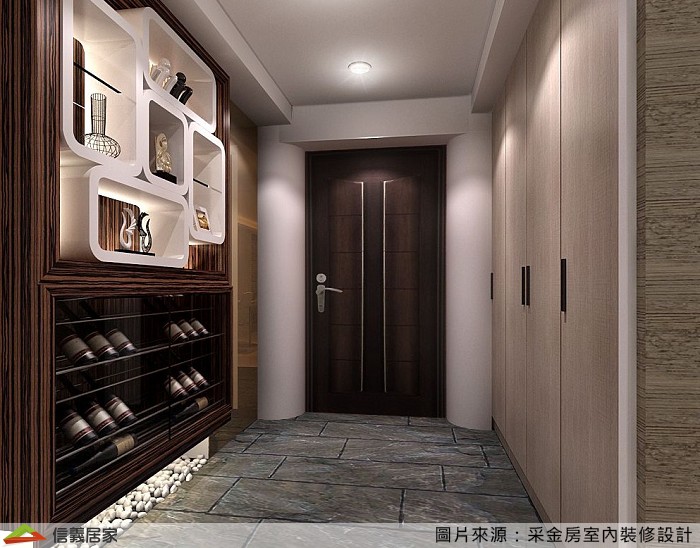 受限於基地關係,因此一進門的玄關是長廊設計,為兼具收納及展示機能,在玄關右側規劃大面積的鞋櫃兼收納櫃體,方便屋主入門時放置物品。屋主喜歡收藏紅酒,則於廊道左側規劃造型置酒櫃,當朋友來時可以先挑選合適的酒再入內共同品嘗。