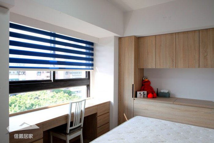 建議書桌可安排在明亮的靠窗處,並將大面積窗戶搭配半透明羅馬簾,不僅開放感十足,更能接收大量自然光,讓坐在桌前閱讀也是種享受,念書累了就看看遠方景色,不用擔心照明不足或眼睛疲勞,傷害了孩子的視力。