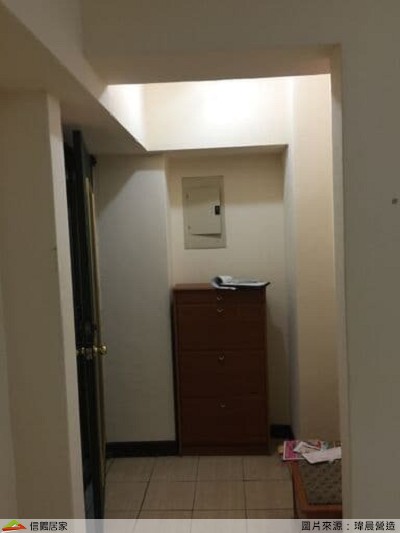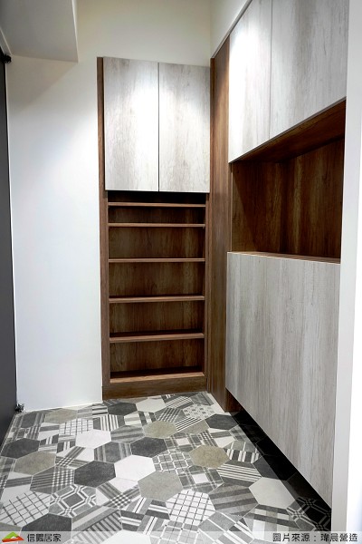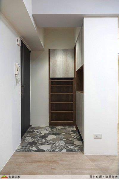 玄關活潑的花磚迎接著主人,恰到好處的分隔出落塵區,落地的開放鞋櫃及騰空的櫃體,一家三口的鞋子及外出用品不怕沒地方放!
