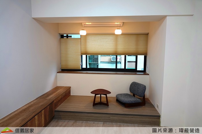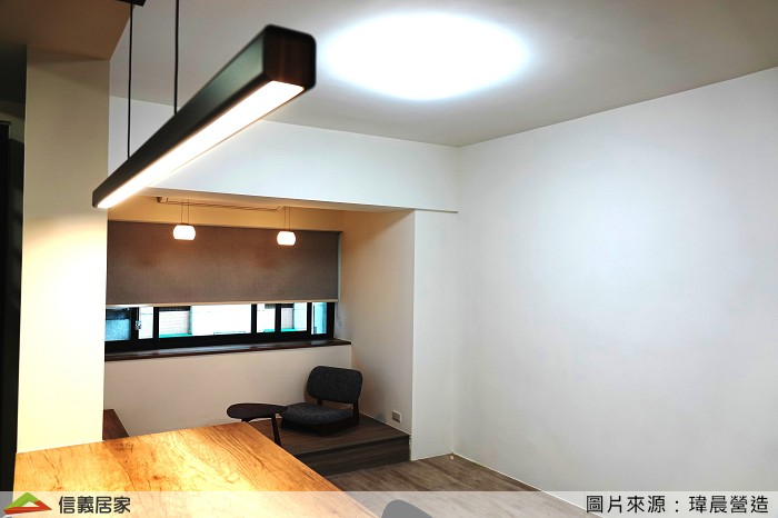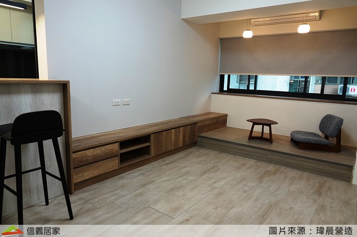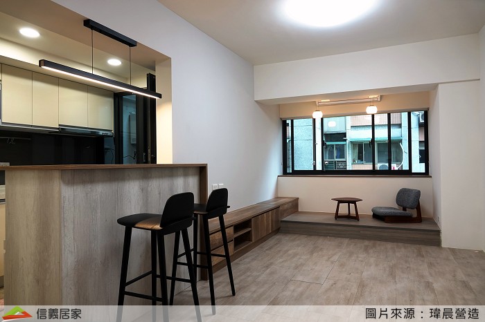 從吧檯延伸的檯面一直延續到窗邊,在視覺上起了將空間放大的效果。窗邊的架高地板讓空間多了變化,同時也增加了多樣的可能性。延續一貫的簡約風格將客廳的家具保持木頭色系並在家具選擇上相互呼應,整個客廳看起來讓人有了踏進無印展示間的錯覺呢!