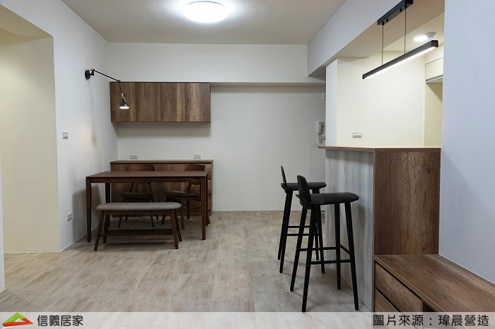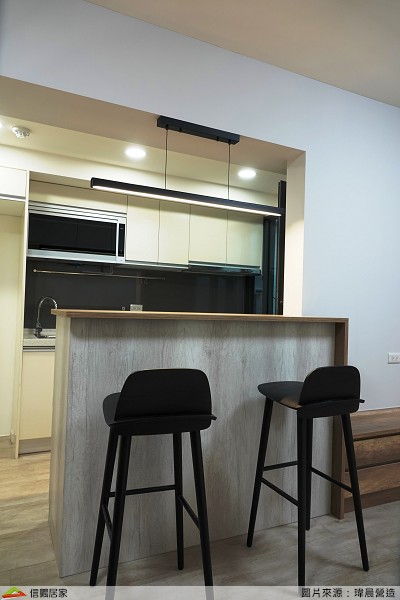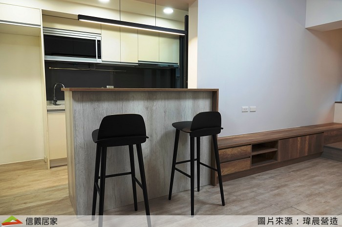 利用壁面及梁柱的空間設置餐櫃,看似不大的櫃子卻有龐大的收納力,餐桌上方一盞俐落小巧的燈,將焦點聚集在桌上的餐點,每道菜都像是主角一樣閃閃發光。打通廚房與客廳的牆面後多出來的吧檯,使得空間變得富含多種可能,可以是早上出門前媽媽與寶貝的早餐時光;入夜後搖身成為夫妻二人談心的角落,在家中有專屬的小酒館。