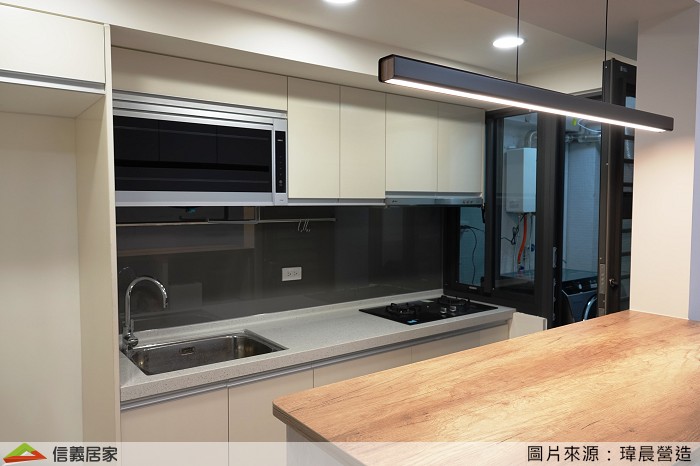 一掃原先狹小的印象,將牆面打通後的一字型廚房看起來光亮鮮明,麻雀雖小五臟俱全,加上吧檯下的收納櫃,容量可是相當驚人呢!廚具配合整體室內空間採用白色系,完成一貫的簡潔風格,淺色更具有放大空間的效果,吧檯上方俐落的燈具高腳椅相互呼應,在這個角落似乎增添些成熟的氣息!