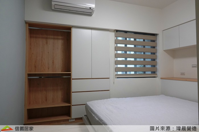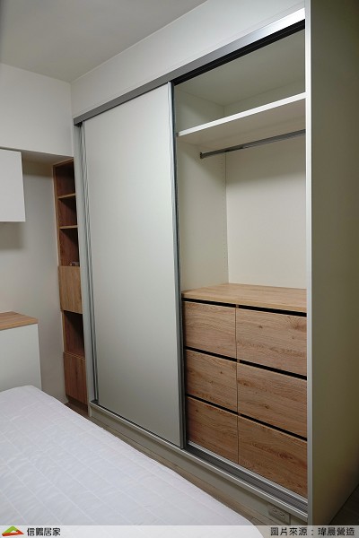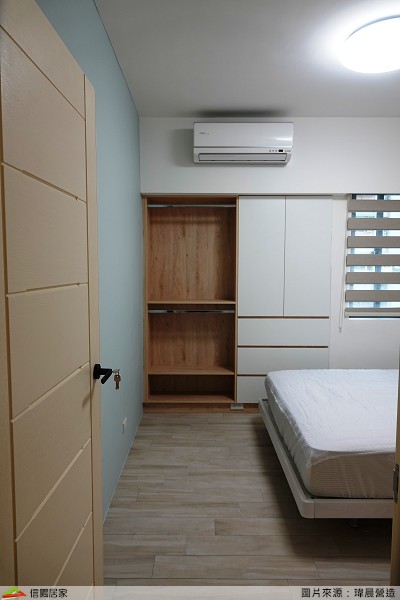 家中主要的生活中心在公共空間,所以屋主希望臥室簡單俐落可以好好睡覺和休息。進門後左側牆面的灰藍色有安定助眠的功用,低亮度的藍色搭配軟質的家飾,使整體降低壓迫及沉重感,臥房內統一以白色系搭配木紋,降低視覺噪音達到放鬆的效果。床頭的木作櫃體避開頂樑的情況,也增加收納空間,衣櫥門片則使用滑門避免落塵又可節省空間!