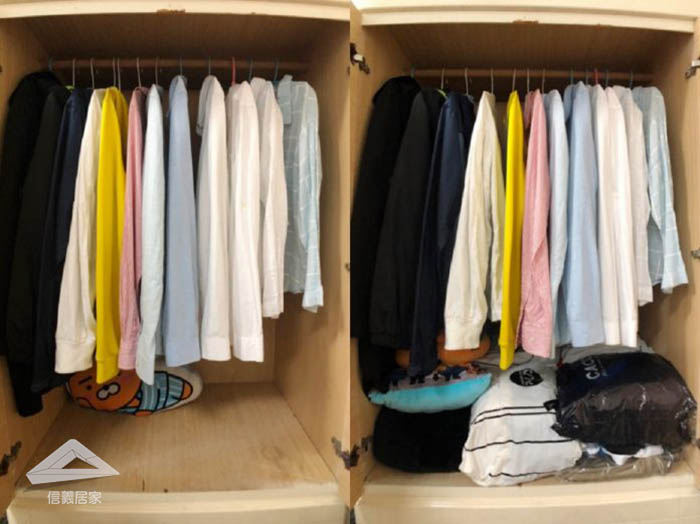 再來把需要掛放的大衣、襯衫等衣物掛上後,衣櫥下方會有滿大的空間,也可用來當作儲物空間,也可擺放適當高度的收納櫃,收納襪子、內衣褲等配件。