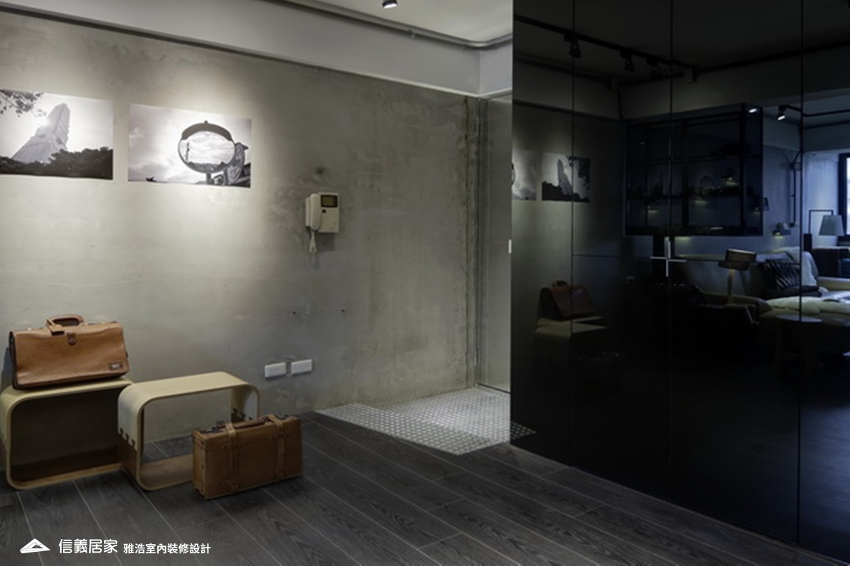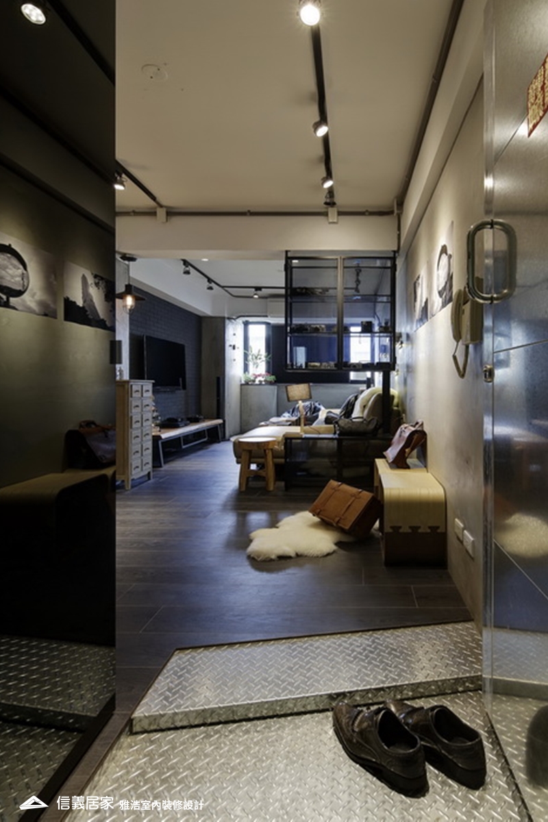 利用白鐵設計簡易的玄關大門,呼應著鍍鋅鋼板的玄關地坪,進家門第一時間就能感受到濃濃的工業味。手扶著清水牆面入內,看到的是以鐵架懸吊呈現結構力學的端景櫃,展示著屋主收藏的各式相機,玄關的清水牆上放的就是屋主的攝影作品。