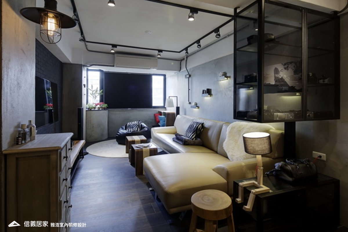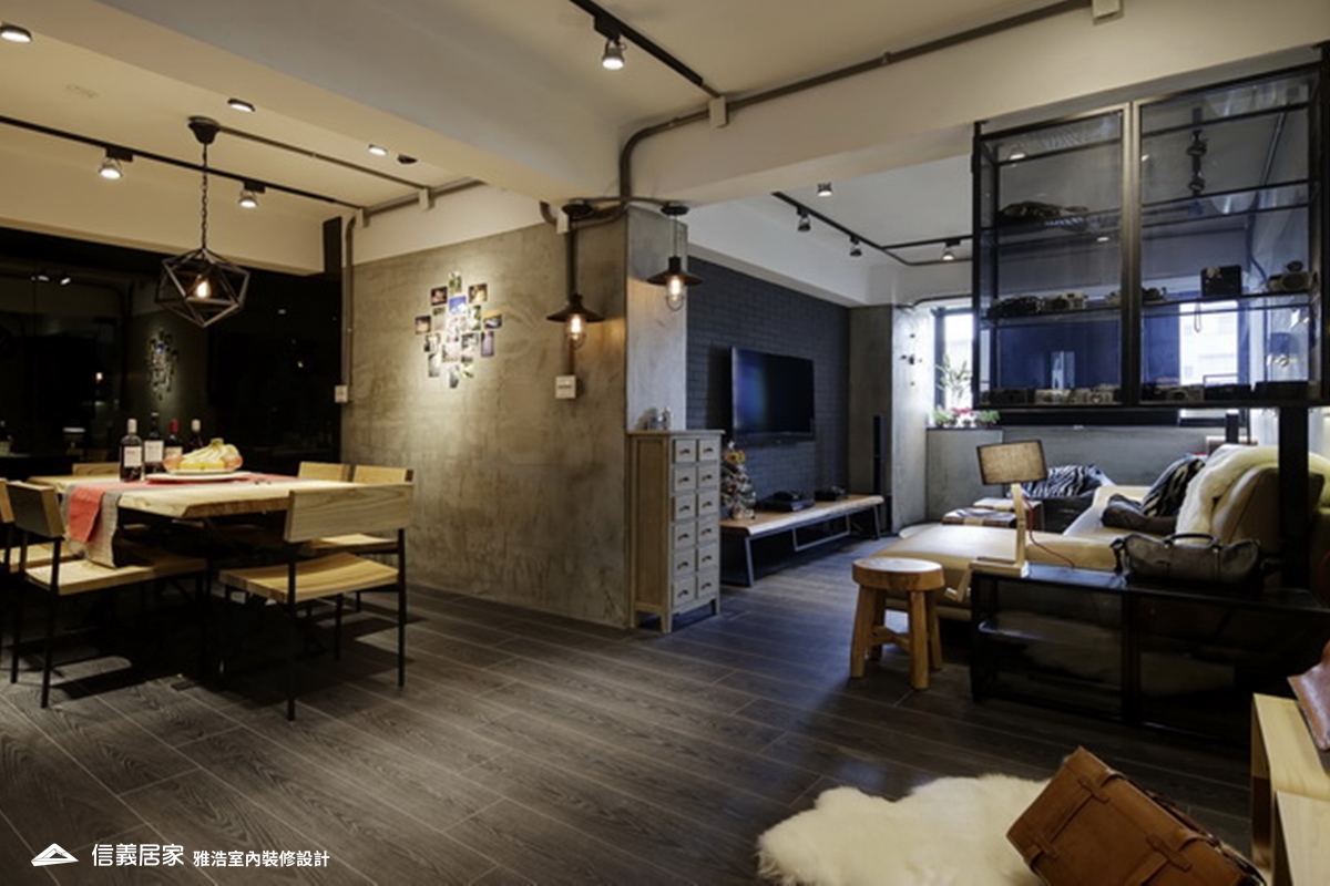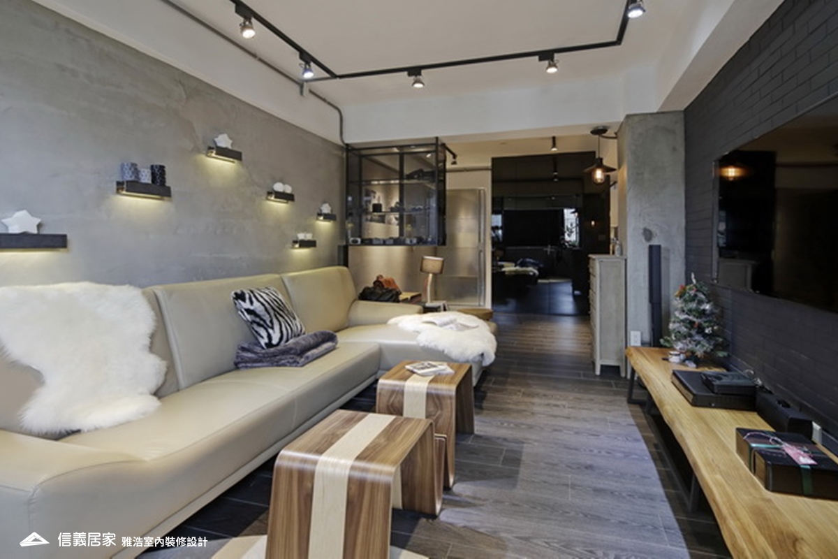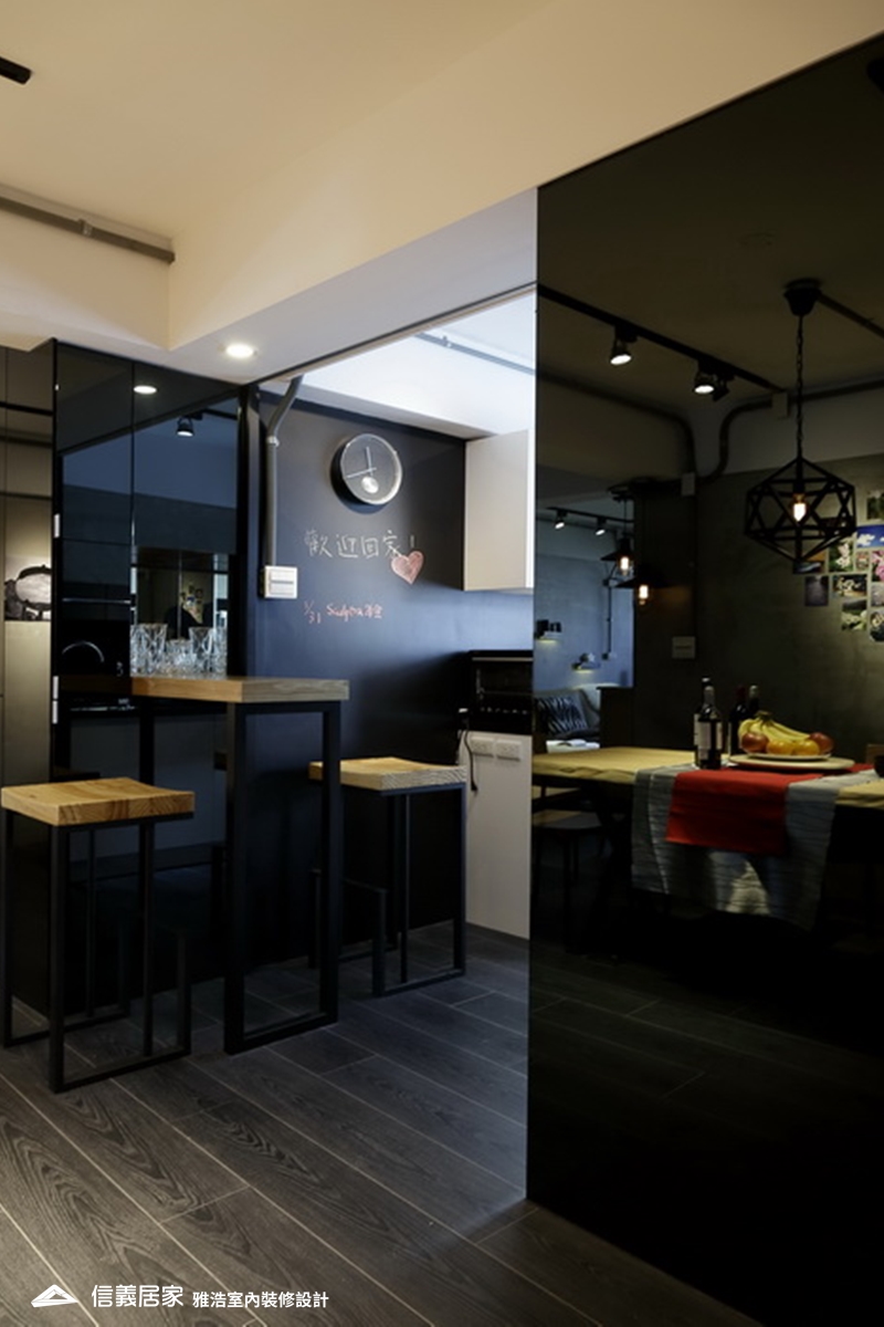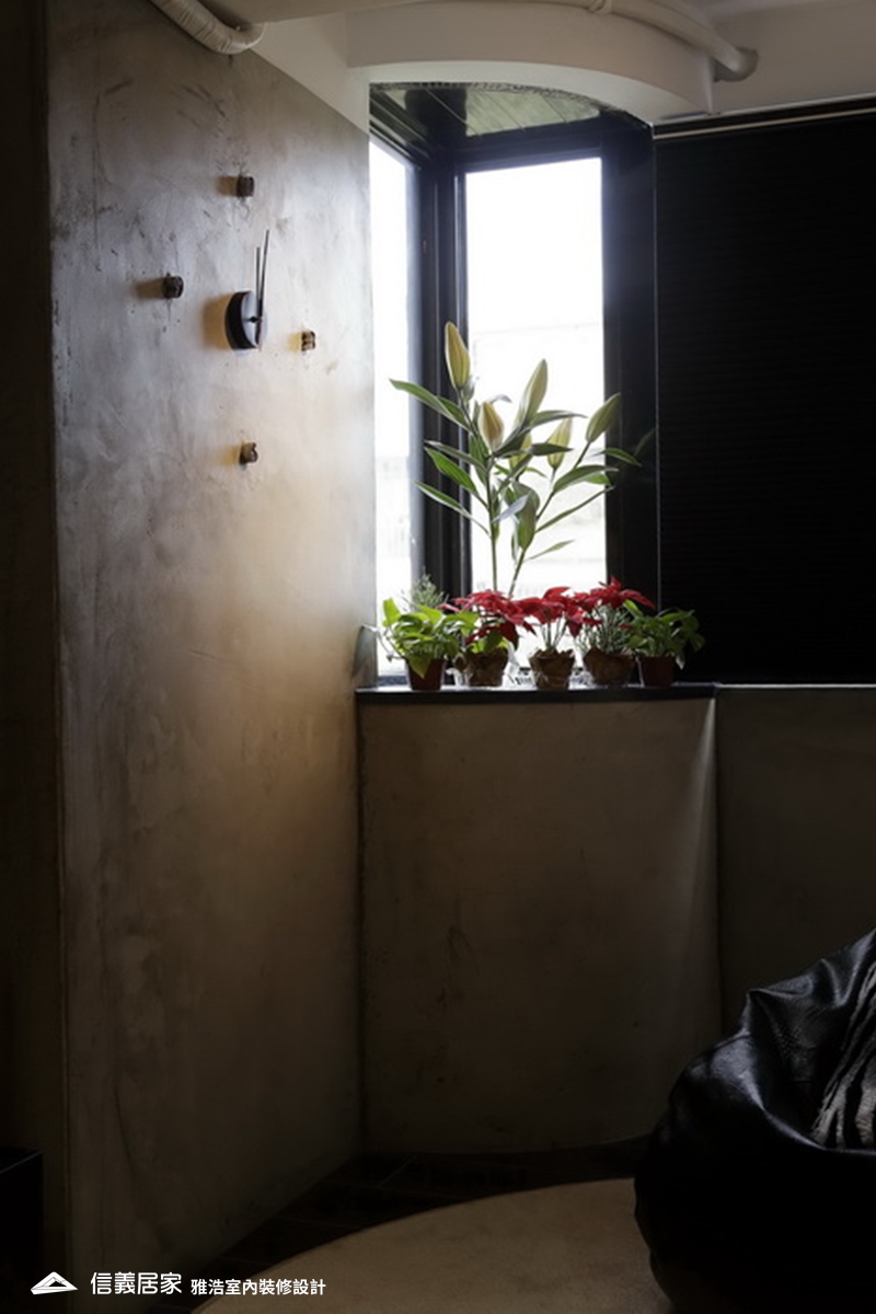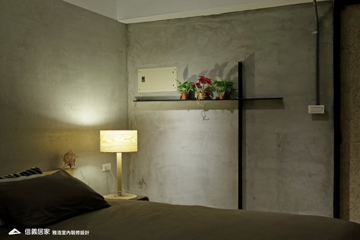 除了工業風材質的呈現外,也確定空間主色為黑、灰,在配置空間的建材、色系、質感與受光性等介面上著墨許久後,決定使用大量黑鏡反差清水牆面的粉光灰,或是甘蔗板牆面,映襯另一種粉光手路形成的灰牆紋理,無論在客餐廳公領域或臥室私領域的不同清水牆面,都有著各自的表情,也定義了該空間的存在感。