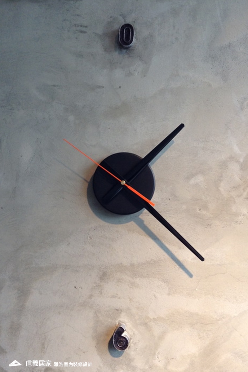 客廳電視牆並非文化石牆,而是客廳與主臥間在新砌磚牆時,特意留下裸磚面作為客廳電視背牆,在全空間色調考量下,最終仍決定將紅磚牆上了深灰帶紫的色漆,只呈現磚紋,看似類文化石牆面,卻又說不上差異性,這是一種自然的紋理。裝修不一定要花重金重工刻意表現質感,反而可以利用既有的材料構造,在工序上微調安排,變化出降成本的設計。電視牆側為業主設計了獨一無二的工業時鐘,金屬數字鑲嵌在清水牆上,也是一種自然融合的時間呈現。