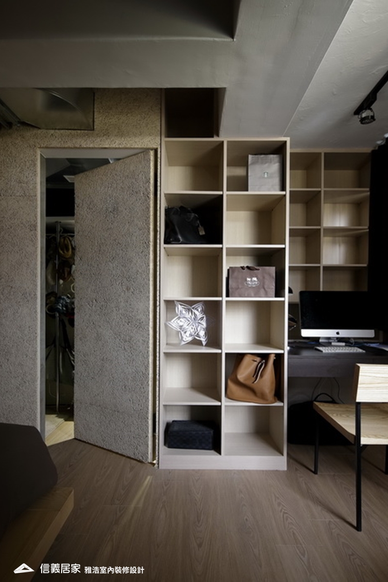 臥室要進入更衣室隱藏門的主牆,利用甘蔗板調節臥室溼氣,讓更衣室保持乾爽。