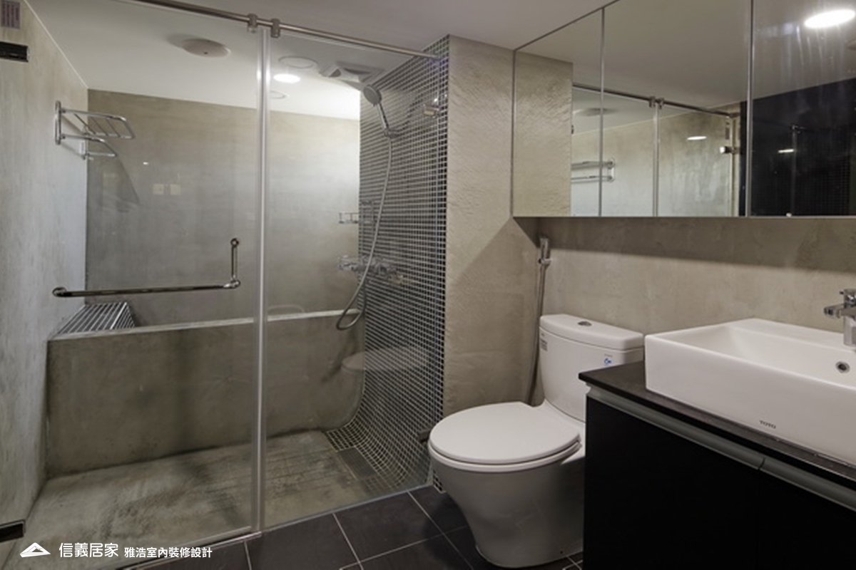 浴室維持工業風的氛圍,主體是清水粉光牆面,淋浴間做無塵式倒角的馬賽克磁磚牆面,和復古馬賽克浴缸成為空間亮點。淋浴間地板也是水泥粉光,利用手刮溝槽作為止滑功效。