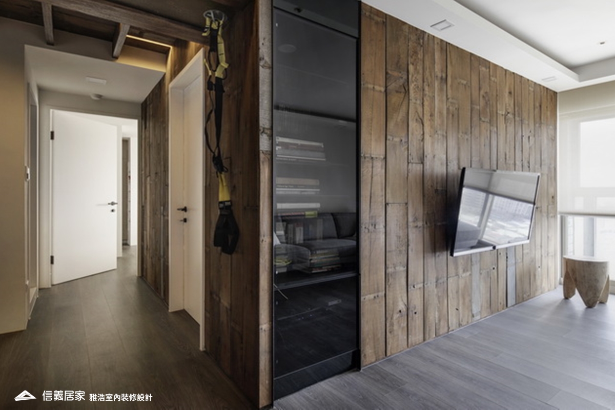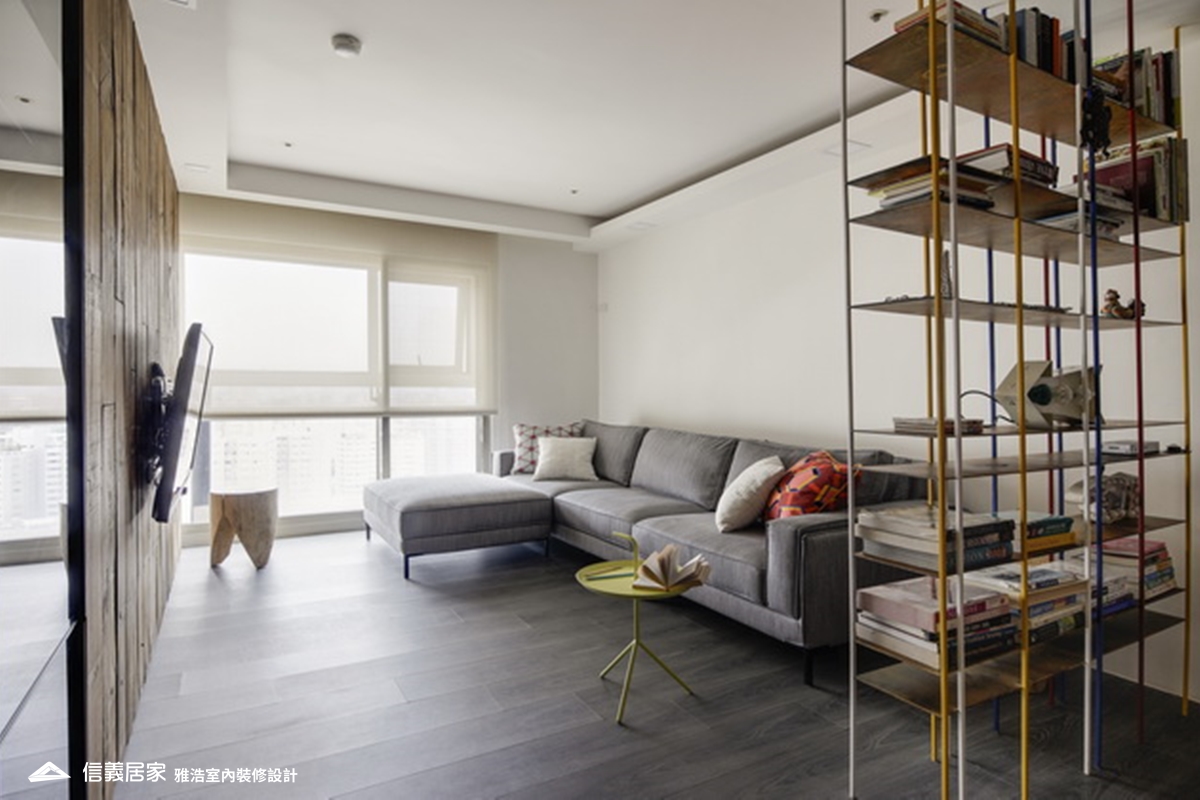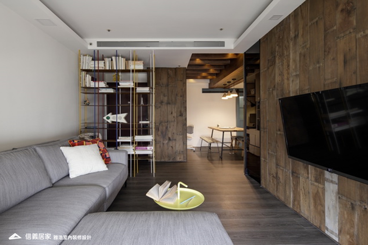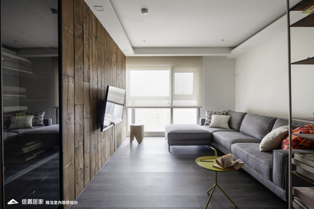 拆掉既有的電視矮櫃及隔間磚牆,以隔間衣櫃背貼檜木板壁掛電視,增加些許沙發與電視牆的距離,並營造客廳原木的暖度。