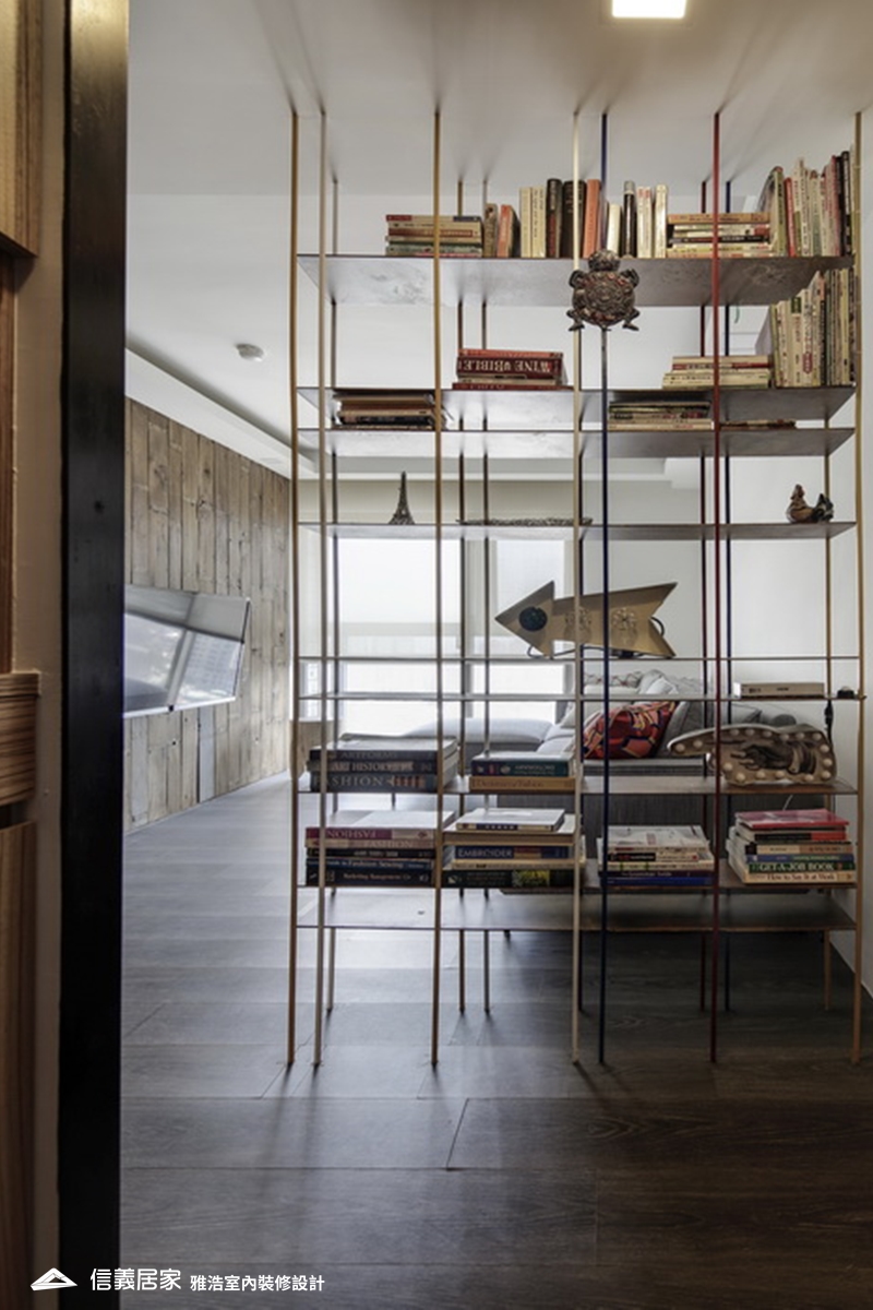 彩色屏風是連結玄關、客餐廳與臥室走道的視覺交點,須輕盈透光,也要有淺收納的機能,女主人說架上物品呈現的是她的氣質與思想,擺設位置皆是思考過的。屏風以三原色跳色出北歐質樸本性中的活潑人文,也可以是玄關入內後引領的媒介。