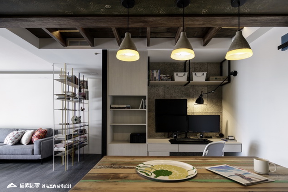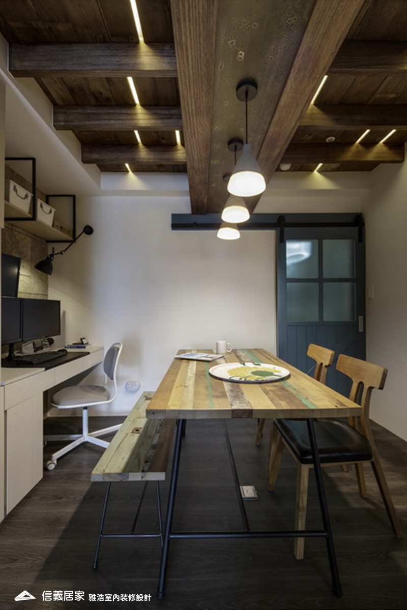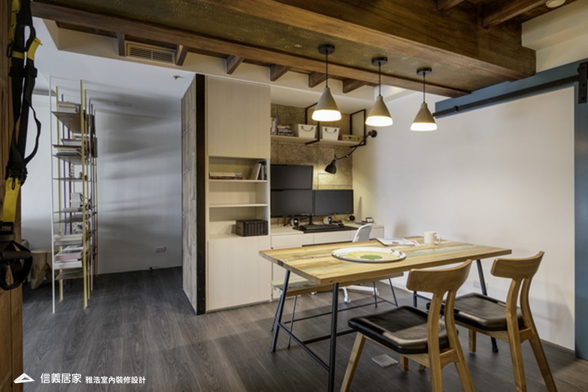 餐廳橫跨大樑,以棧木樓板及假桁木樑結構,化解大樑壓迫感,棧木樓板縫隙透出來自閣樓的光,作為餐廳光源。大樑於客廳端掛著男主人的健身拉力繩,也成為延伸性的視覺焦點,而內端景會落在通往廚房的倉儲拉門,以灰藍色收尾。餐廳中的工作桌,則利用灰色甘蔗板及吊架將系統櫃融合環境中。