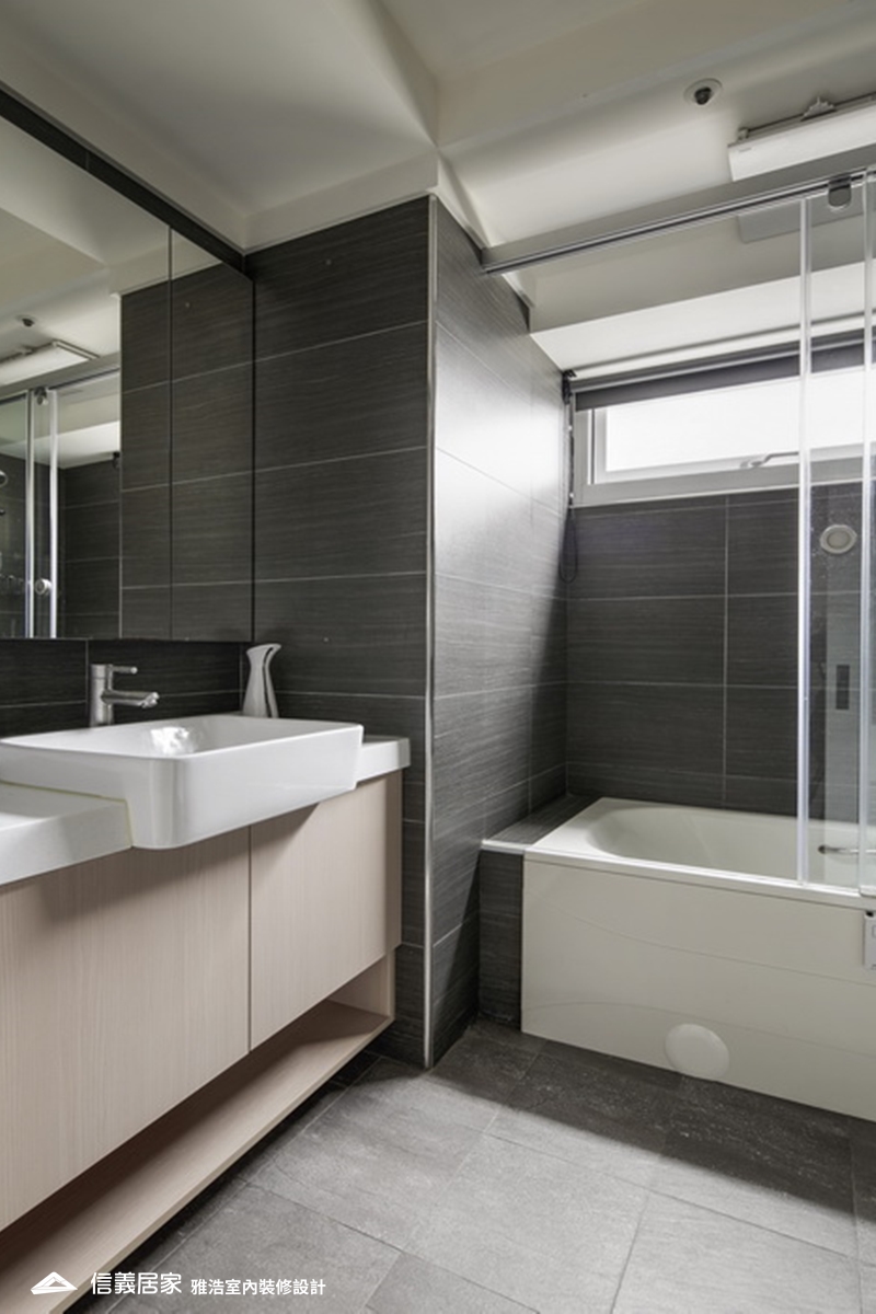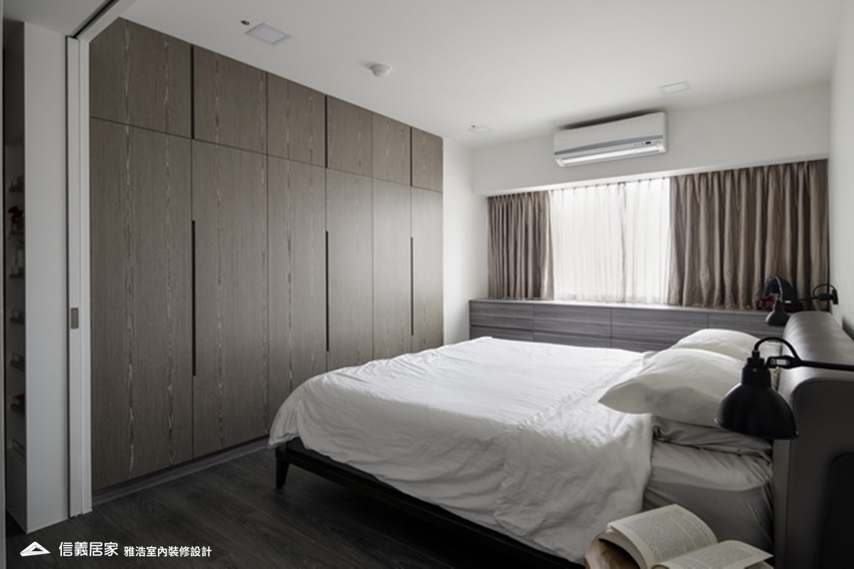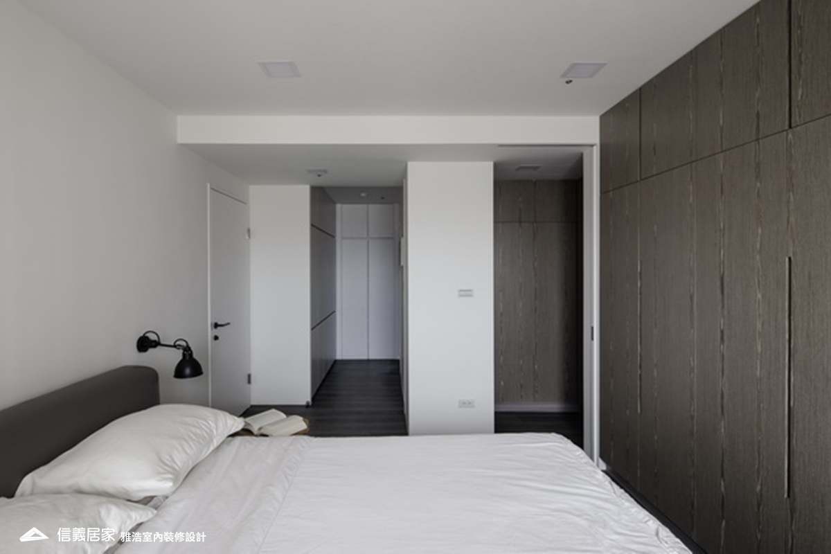 將原三房中的小臥室改為主浴室,而原主衛浴則改為有隱藏拉門的半開放小更衣室,並在通往主衛浴的走廊增設了收納櫃及底端的儲藏室。