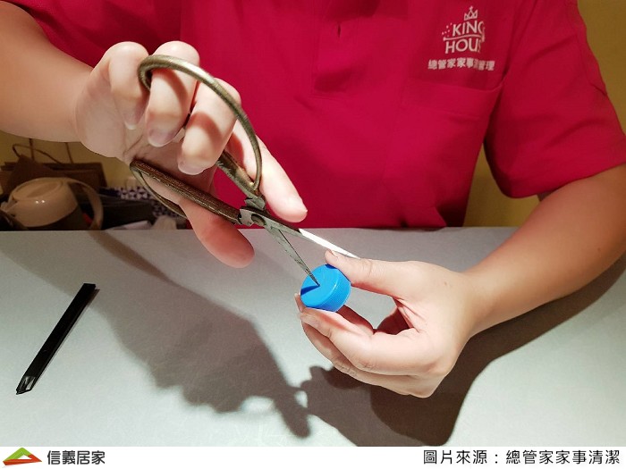 Step2.用剪刀在瓶蓋中央鑽一小孔,孔徑大小約吸管口徑